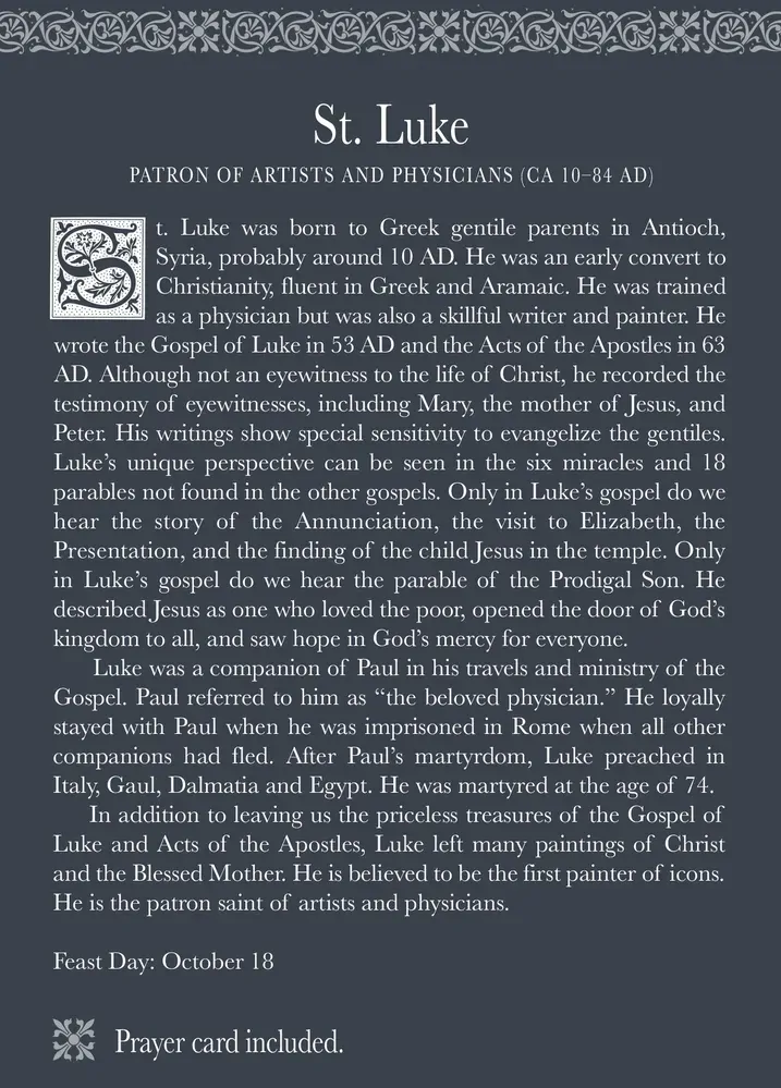In addition to leaving us the priceless treasures of the Gospel of Luke and Acts of the Apostles, Luke left many paintings of Christ and the Blessed Mother. He is believed to be the first painter of icons. He is the patron saint of artists and physicians.
