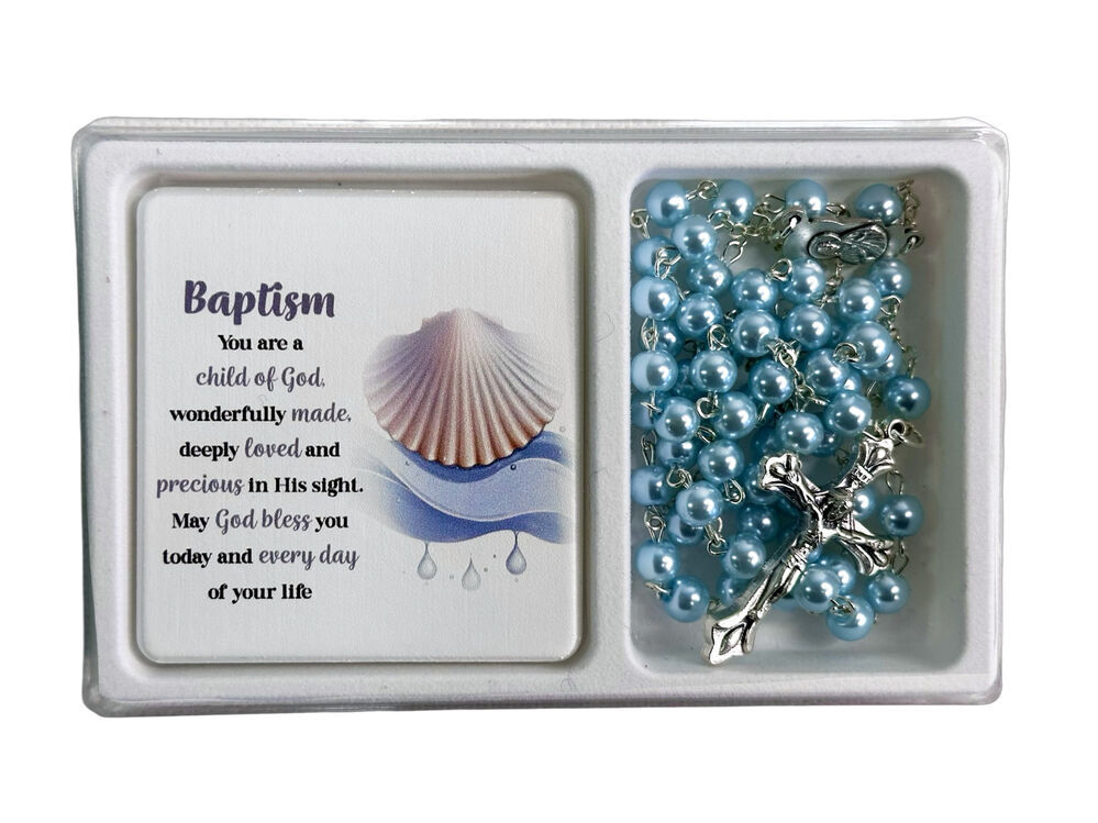 A beautiful gift set comprising of a glass rosary with pearly blue beads, plus a small square plaque with a Baptism message and a seashell & water motif. Plaque can be displayed standing.