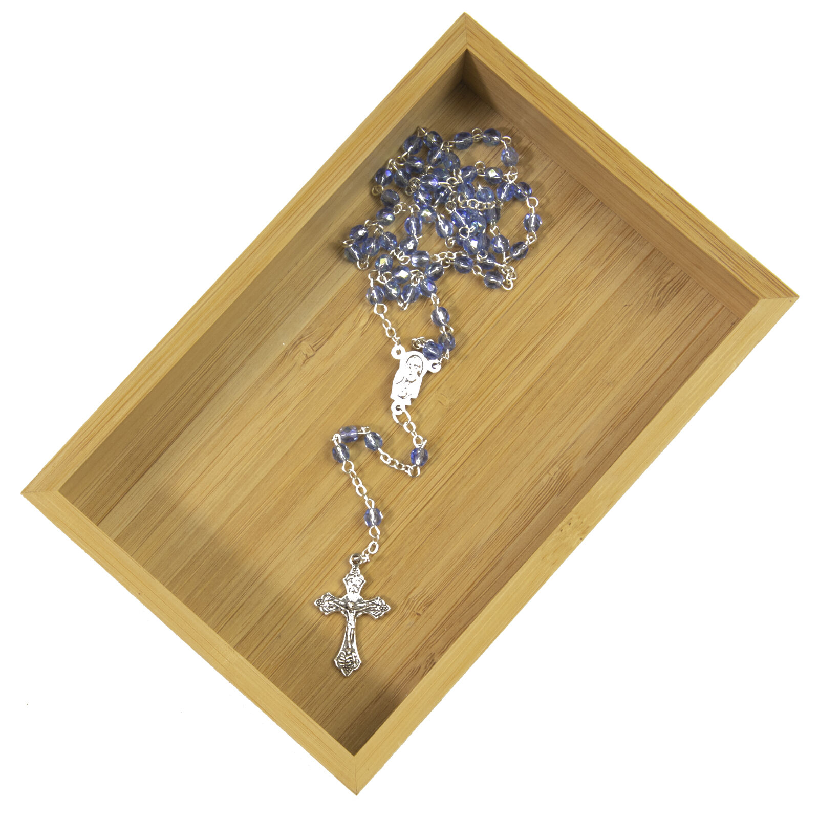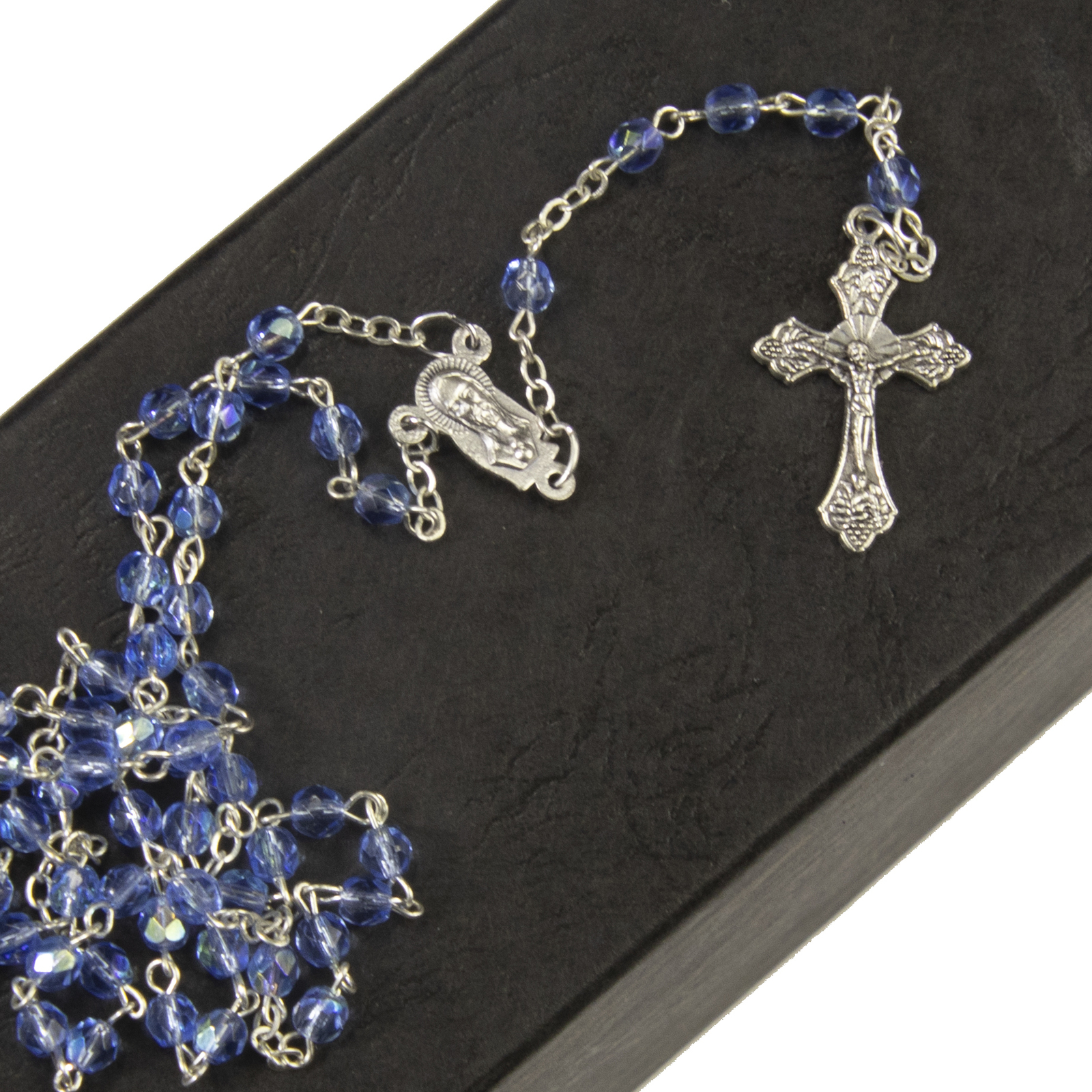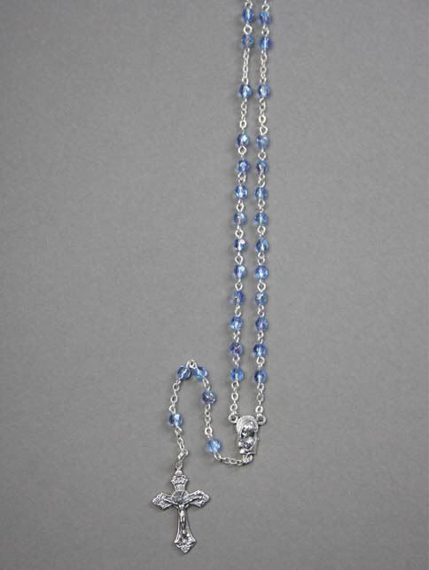 This beautiful set of rosary beads is made of blue-coloured crystal beads coated in a layer of AB which gives them an iridescent look, changing colour as it moves. It also features a metal crucifix and center medal. It would make the perfect gift for a special occasion such as First Holy Communion or Confirmation.