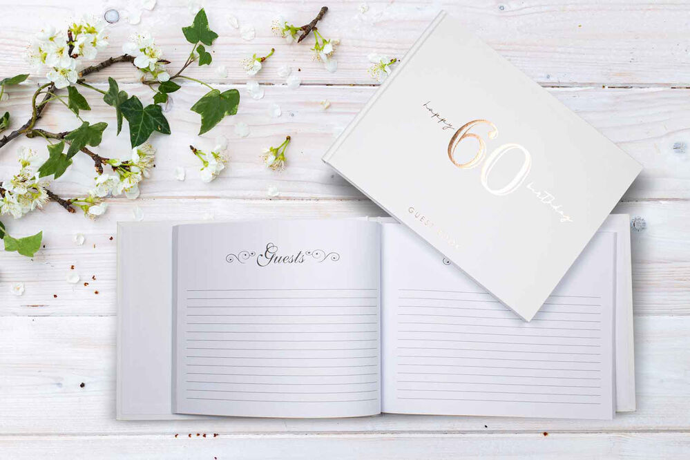 - Hard cover in white, rose gold text that reads "Happy 60 Birthday".
