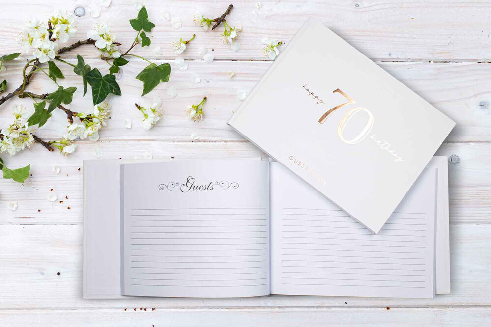 - Hard cover in white, rose gold text that reads "Happy 70 Birthday".
