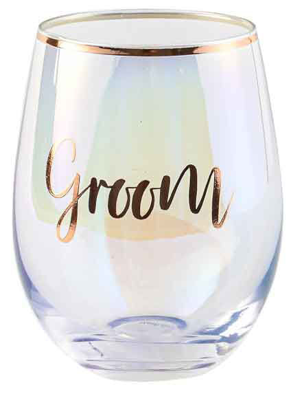 Commemorate the Groom's special day with this beautiful stemless wine glass.
