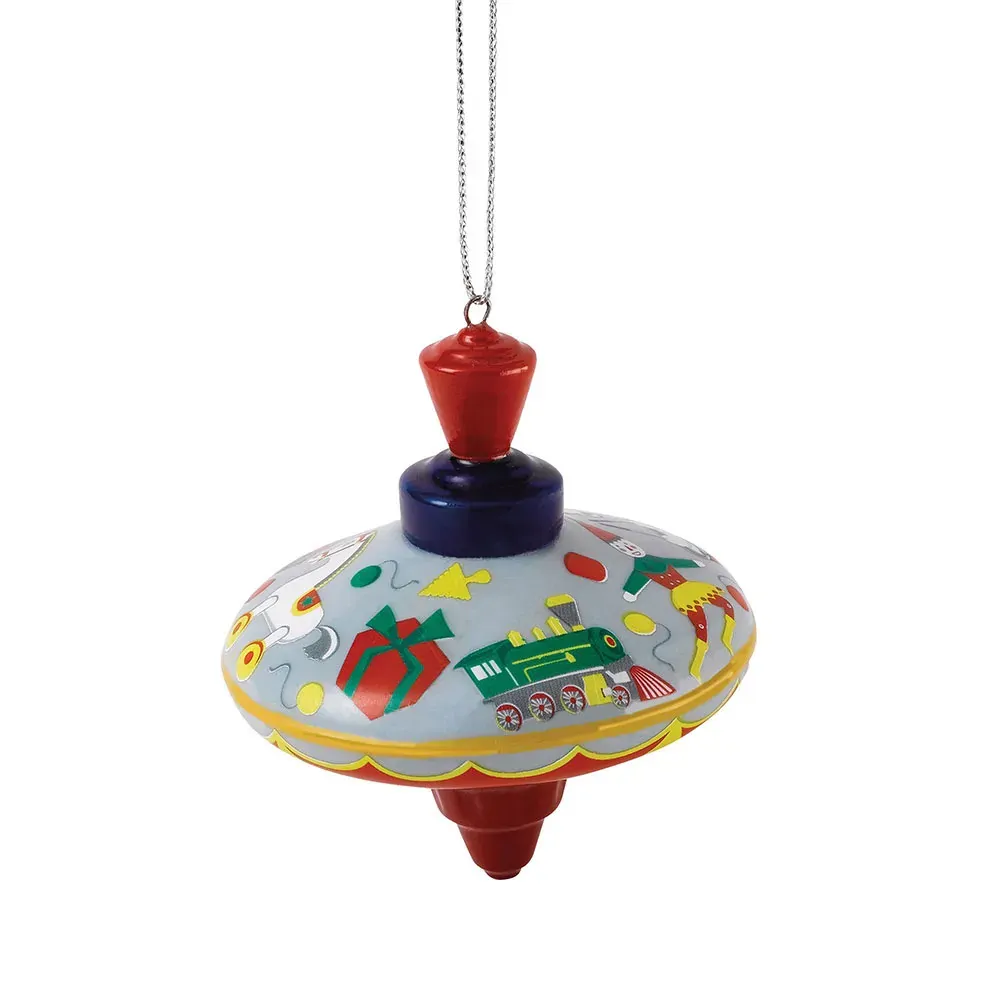 One of the most nostalgic of childhood toys is the tin spinning top that needed careful balancing and pumping to get it to both spin and melodiously hum. The brightly decorated Spinning Top Christmas Tree Ornament is guaranteed to bring those memories swirling back.
