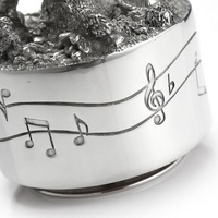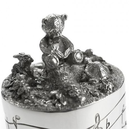 A charming wind-up music carousel in pewter featuring teddy reading to his forest friends at the picnic.