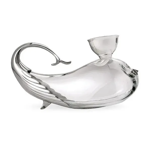 The Mediterranean is home to several species of cetaceans, including the fin whale, the world’s second largest mammal. Taking full advantage of its source of inspiration, the novelty whale decanter includes a specially designed companion funnel which spouts wine to cascade down the inner walls, working in tandem with the decanter’s recumbent form to maximise aeration. In glass and brilliant finish pewter.
