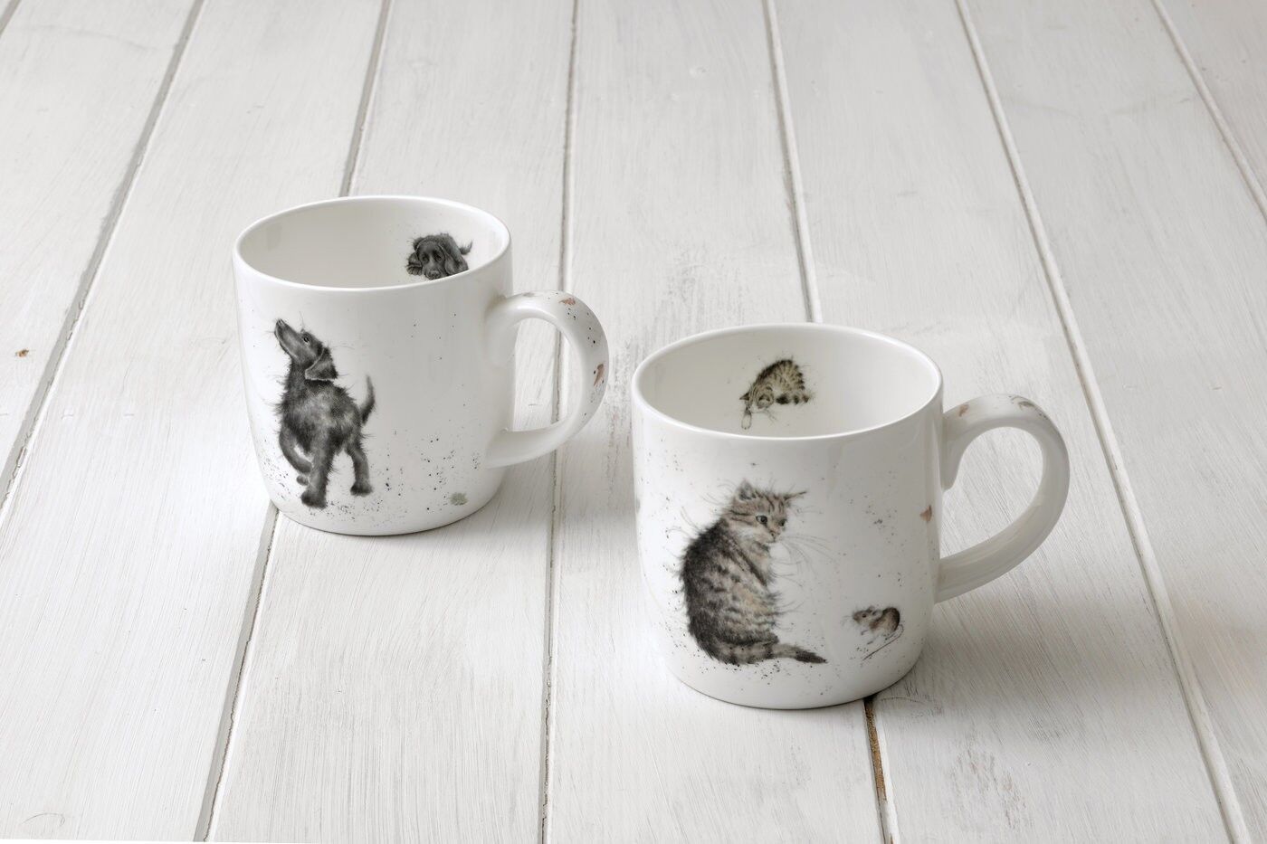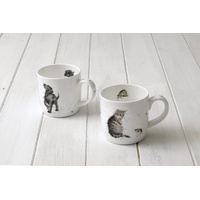 The tender illustration of two 'frenemies' on the side of this fine bone china mug is sure to brighten any morning. These playful and curious cat and mouse characters are captured perfectly in artist Hannah Dale's expressive watercolour style. Signature flecks of colour add some extra vibrancy to the loveable couple, who also appear in a separate scene inside the mug. Suitable for a round in the dishwasher, this quality item brings an idyllic country mood to any breakfast table setting.