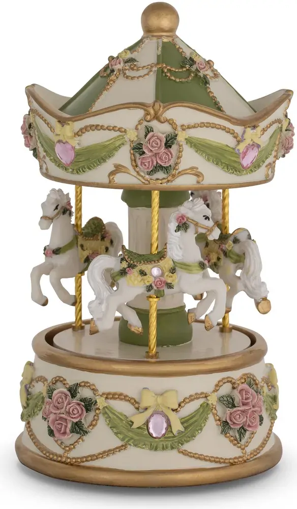 A beautifully detailed carnival carousel with 3 horses in shades of soft pink, green, cream and gold, and a floral motif.