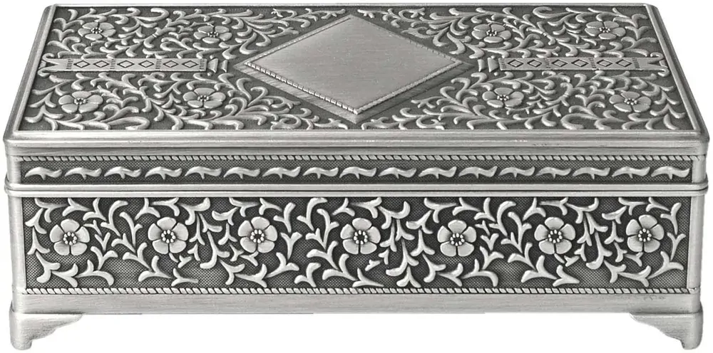 A pewter finish footed rectangular box with intricately carved details in a floral motif and diamantes, perfect for storing jewellery or trinkets.