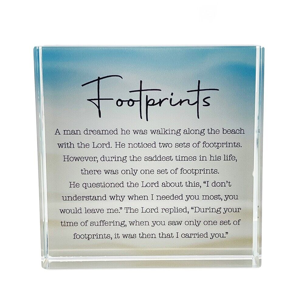 - Glass Block Reads: "Footprints. A man dreamed he was walking along the beach with the Lord. He noticed two sets of footprints...."