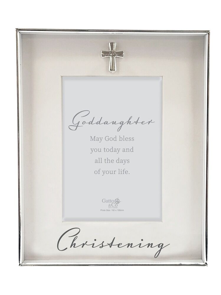 A beautiful silver photo frame with a lovely message to celebrate your goddaughter's Christening. Frame measures 175 x 215mm and holds a 4 x 6 photo. Comes ready in a box.
