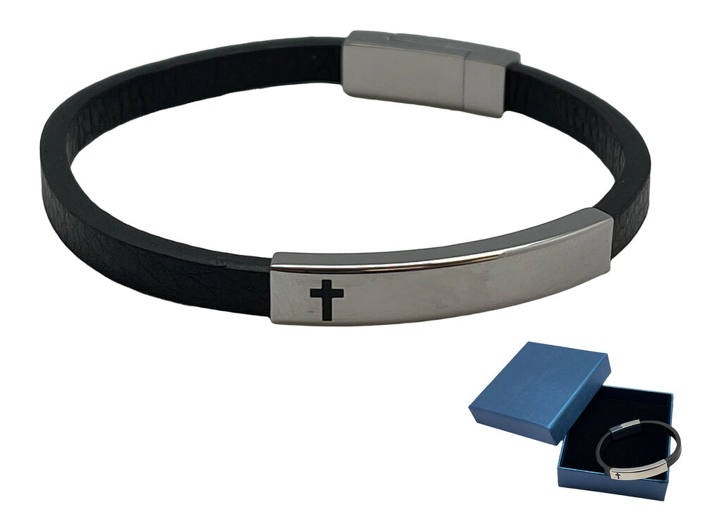 STAINLESS STEEL LEATHER BRACELET WITH CROSS