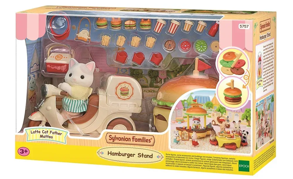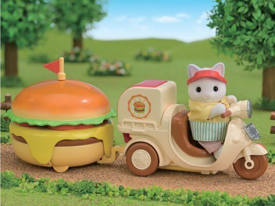 Comes with over 30 accessories including cute hamburgers with cat ear-shaped buns and drinks.The hamburger stand can be set up in two ways?shop mode and transport mode. The hamburger stand can be attached to the delivery bike and driven around.