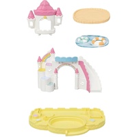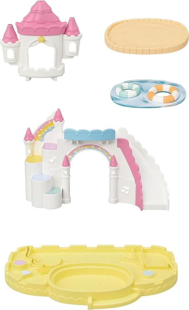 This set comes with a Flora Rabbit cradled baby. The castle has windows where the babies can peek out from and a big slide. There are cute toys for playing in the sandbox and pool, including a bucket, scoop and ball. The pool has swimming rings that the babies, including cradled babies, can fit in. The Flora Rabbit cradled baby is named Thyme.