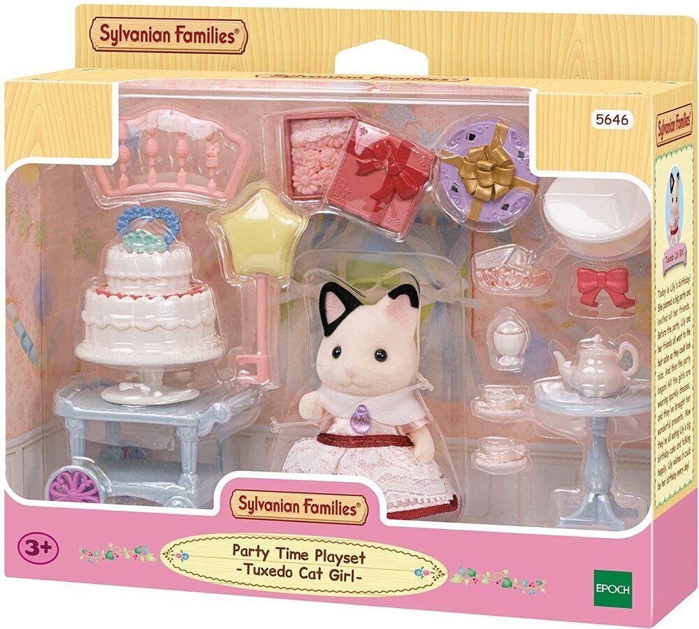 The Party Time Playset features Tuxedo Cat girl Lily in an exclusive party dress, plus a lavish two-tier cake and presents. Comes with toppings to help decorate the cake. Both the top and bottom tiers of the cake can be served on separate plates. Place the cake or tea set on the cart to move them about. The star-shaped balloon can also be attached to the cart. The Alice band can be worn by the included figure. It can also be placed inside a present box.