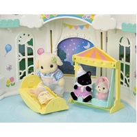 The Sylvanian Families Sunny Castle Nursery set consist of a nursery with changeable weather and the Flora Rabbit Baby!