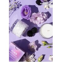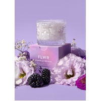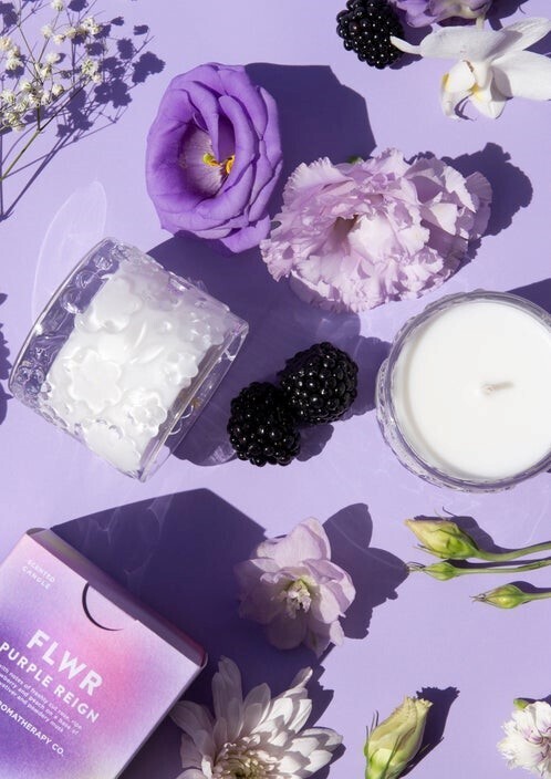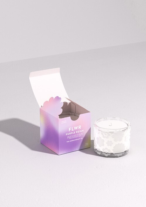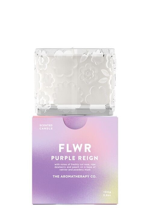 The Aromatherapy Co FLWR Purple Reign Candle combines notes of freshly cut rose, ripe dewberry and peach on a base of vetiver and powdery musk.