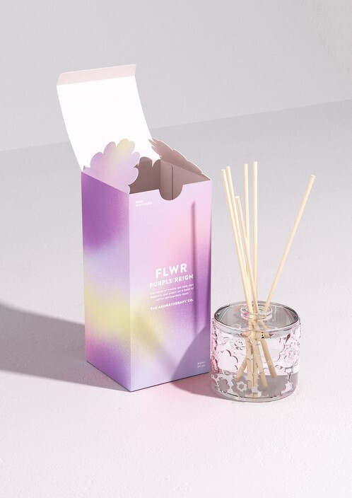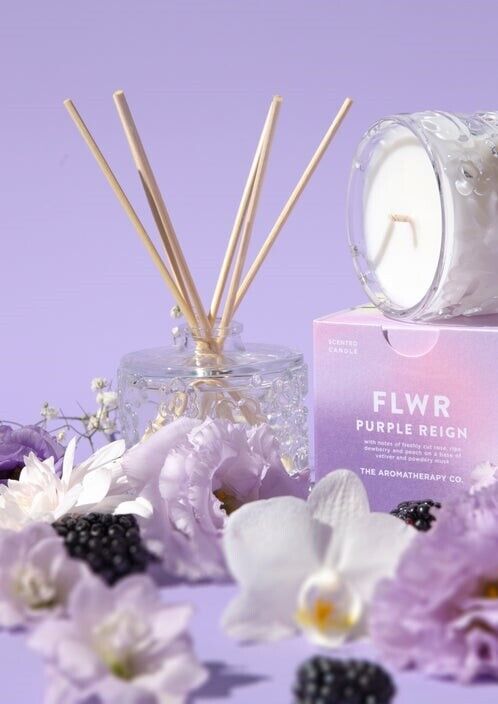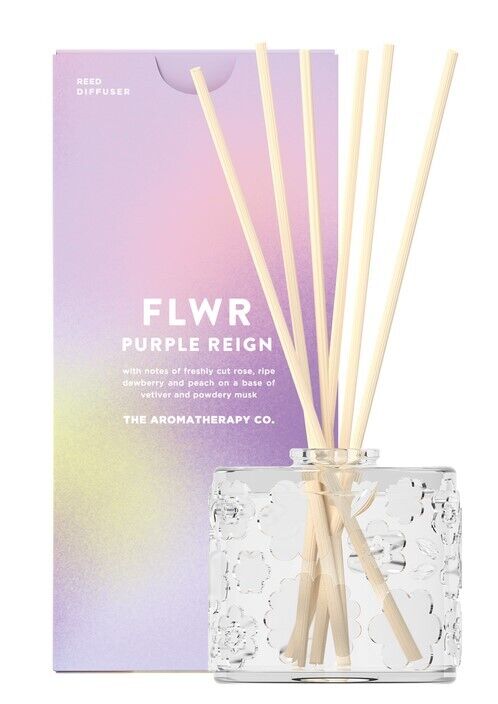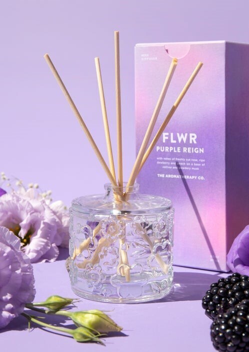 The Aromatherapy Co FLWR Purple Reign Reed Diffuser combines notes of freshly cut rose, ripe dewberry and peach on a base of vetiver and powdery musk.