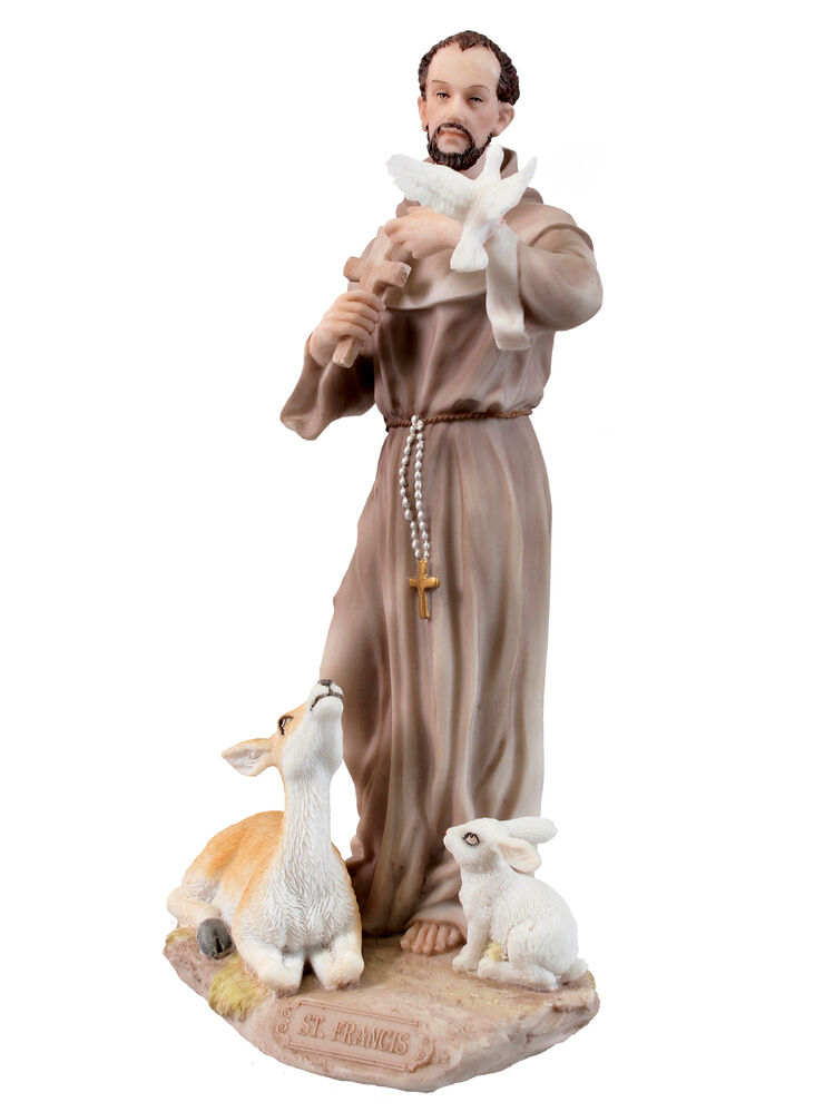 This statue depicts a lovely scene of St Francis of Assisi holding a cross as a dove takes flight from his arm, with a fawn and rabbit looking on from his feet. Inscribed at the bottom on a plaque is 'St. Francis'.