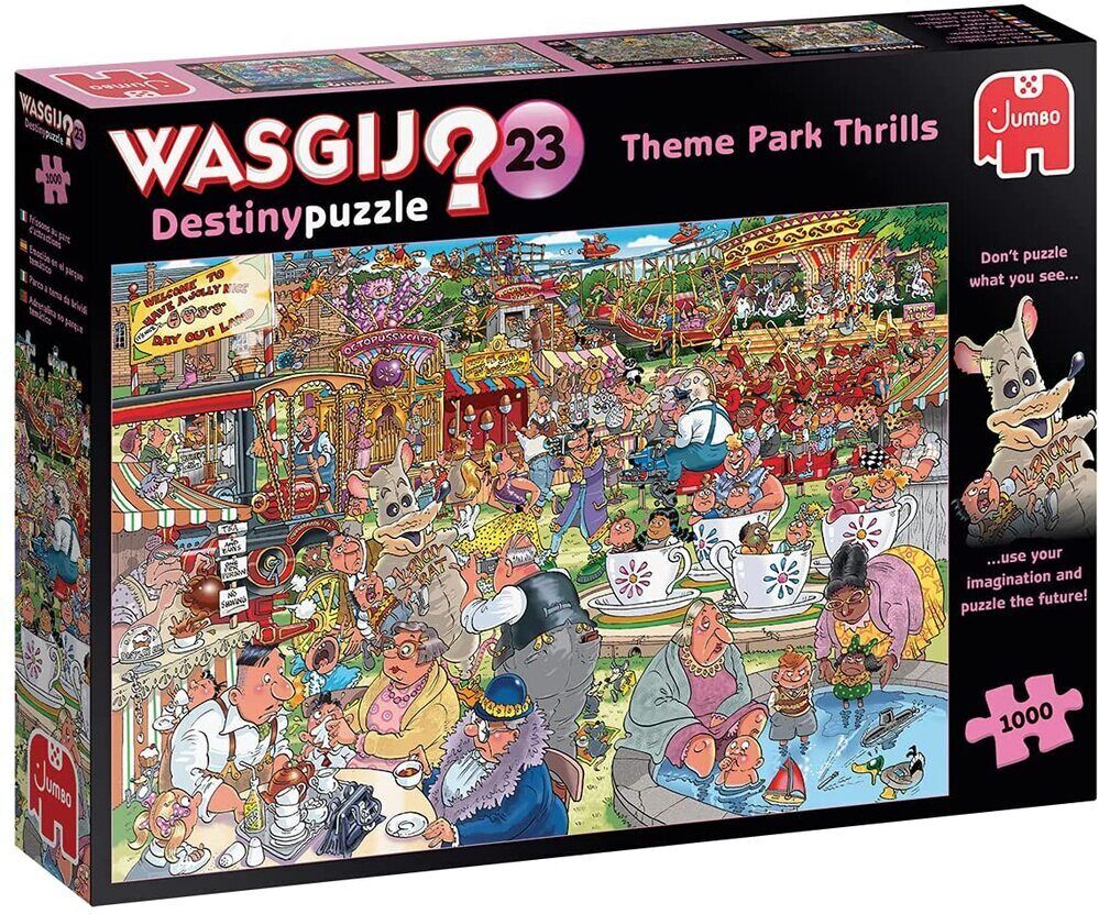 Theme Park Thrills!' is the title of this hilarious Wasgij Destiny 22, 1000-piece jigsaw puzzle. For decades families flocked to 'Have a Jolly Nice Day Out Land' for its charming rides and attractions, including vintage carousels, teacups, coconut shies and their tired-looking mascot that's always ready to pose for pictures. Modern thrill-seekers need adrenaline-fuelled entertainment that's truly state-of-the-art, with extreme rides and roar-some attractions that leave you in tears of joy. or terror. Just how different does the action-packed amusement park of today really look? This is the scene you have to puzzle!