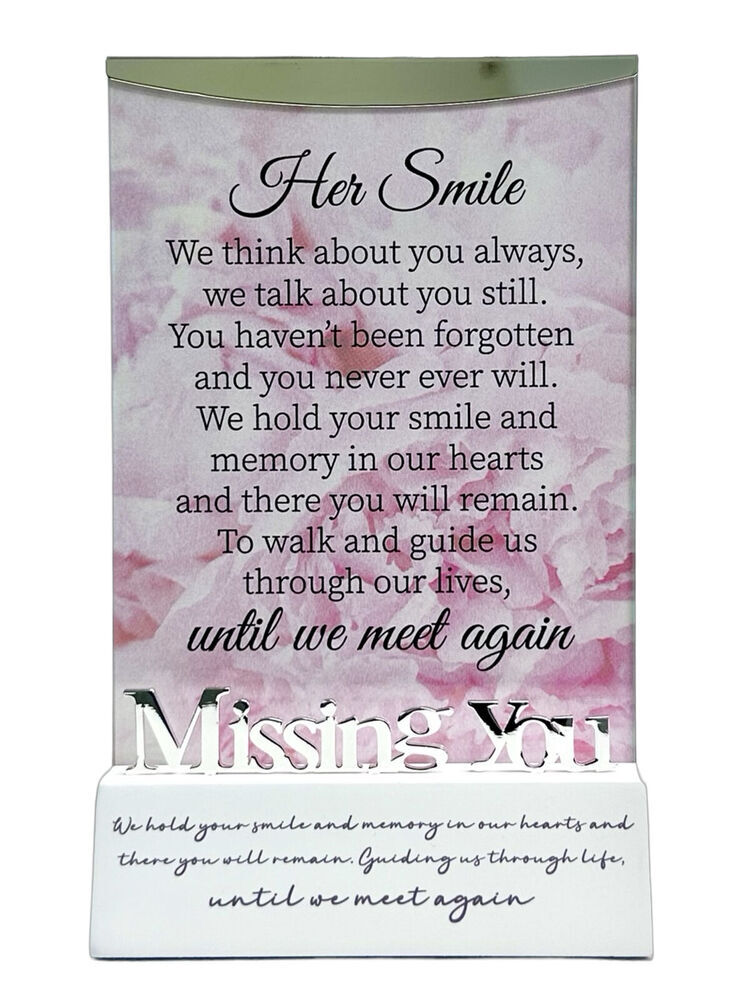 Message reads: 'Her Smile. We think about you always, we talk about you still. You haven't been forgotten and you never ever will. We hold your smile and memory in our hearts and there you will remain. To walk and guide us through our lives, until we meet again. Missing You. We hold your smile and memory in our hearts and there you will remain. Guiding us through life, until we meet again.'
