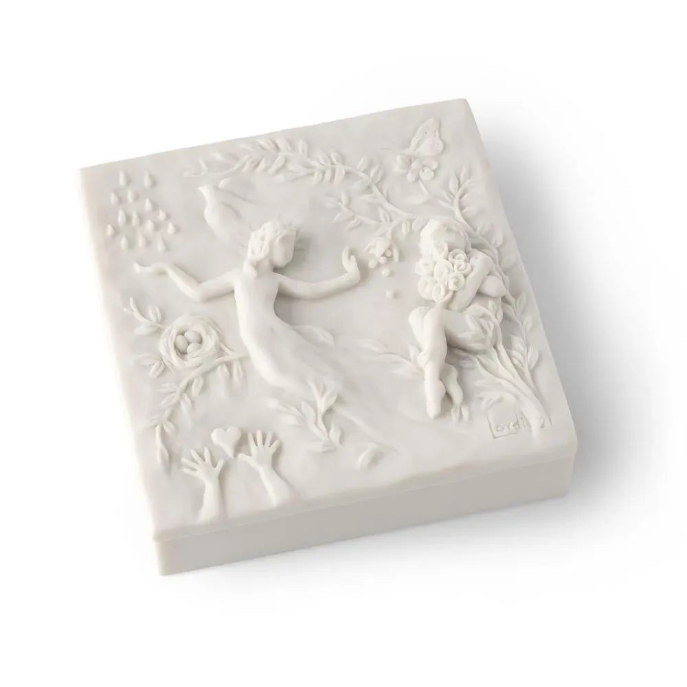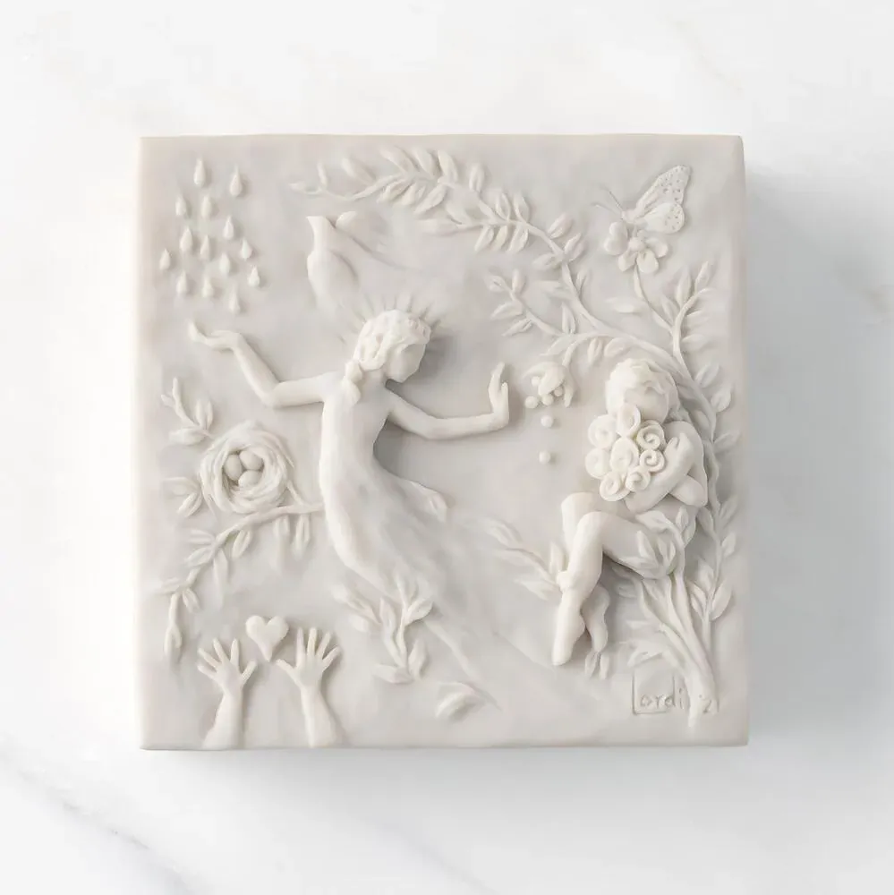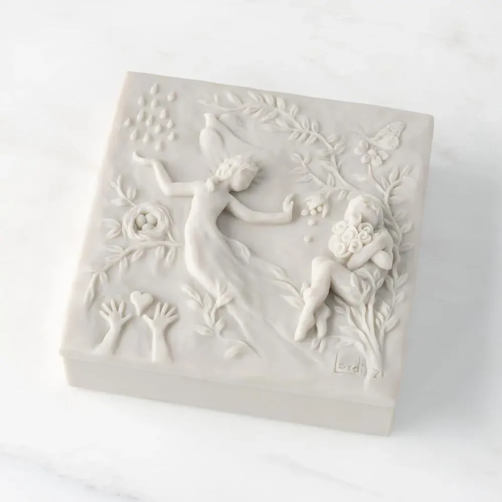 A beautiful and functional box for jewelry and keepsakes. Lid is carved with healing elements of nature and figural imagery. Bottom of box has a velvety soft finish. Detached lid, with sentiment printed on back, can be hung on wall as a decorative plaque.
