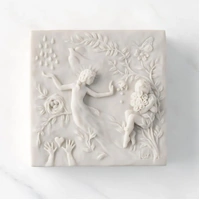 This piece is a square off-white resin box. The lid is carved with organic and figural symbols; sentiment printed inside lid. Box base has velvety finish inside.