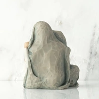This piece features a figure in a cream garment and wavy brown hair, with her arms around two younger children, all wrapped in a light blue-grey blanket.