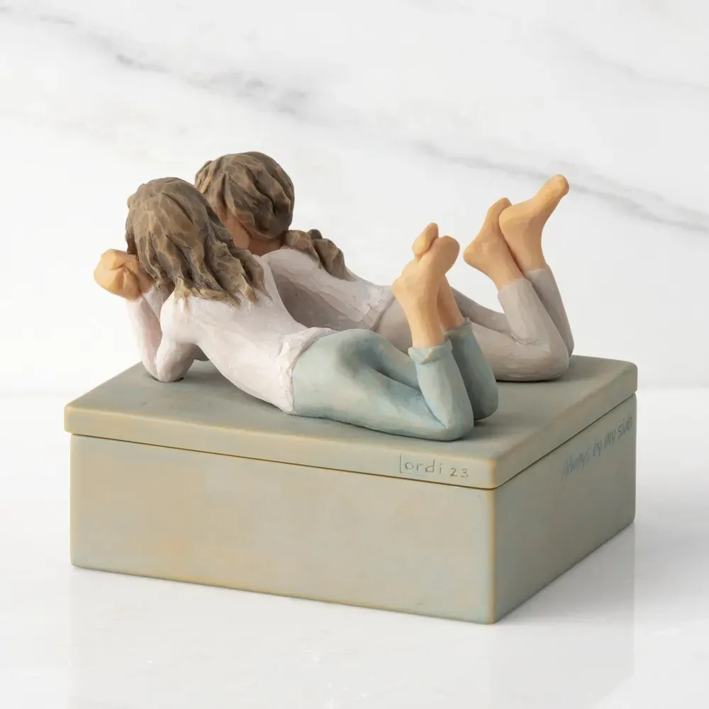 A beautiful functional box for jewelry and keepsakes that evokes memories of being present with a close friend or sister. Detached three-dimensional lid. Sentiment is carved on outside of box back.