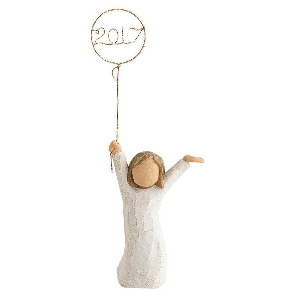 This piece features a figure of a girl in a cream dress, her arms extended upwards, holding a gold wire sign in the shape of a balloon with '2017' in the center of the circle.