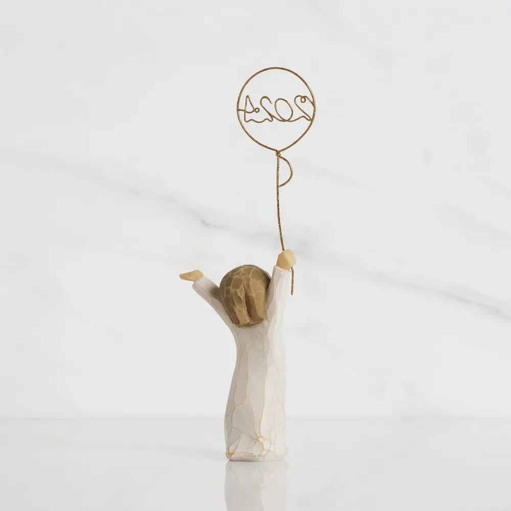 This piece features a standing figure in a cream dress, holding a gold wire balloon with '2024' written in gold wire inside the balloon.