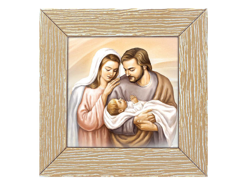 A stylish wood and resin-looking frame housing a beautiful depiction of the Holy Family, with Joseph holding baby Jesus as Mary lovingly looks on. Suitable for hanging or standing.