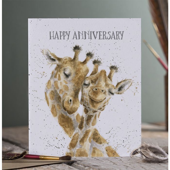 Wish someone a Happy Anniversary with this card which features a beautiful illustration of two giraffes and reads 'Happy Anniversary'. The card is printed on beautiful textured board sourced from the Lake District and is supplied wrapped, with a kraft recycled envelope. This card is blank inside for your own message.