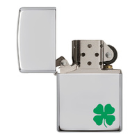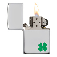 This High Polish Chrome windproof lighter has a four leaf clover color imaged on this lighter. Comes packaged in a gift box. For optimal performance, fill with Zippo lighter fluid.